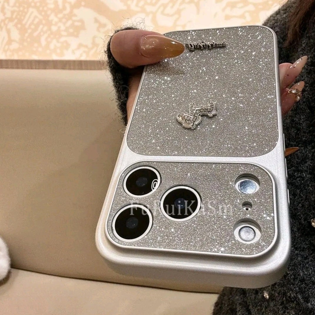 048.高級感キラキラ✨グリッター×ラインストーン小馬デザイン iPhone17 Pro Max対応ケース 耐衝撃 落下防止 iPhone16ストラップ対応 iPhone15おしゃれカバー(リボン型シルバービジューチェーン付き)